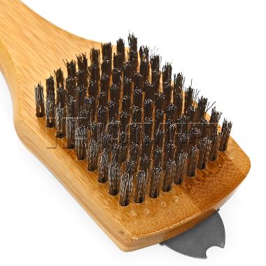 Le setole della spazzola sono realizzate in acciaio mente sul retro si trova un raschietto dentellato per pulire bene i tondini della griglia dal grasso o altri residui.