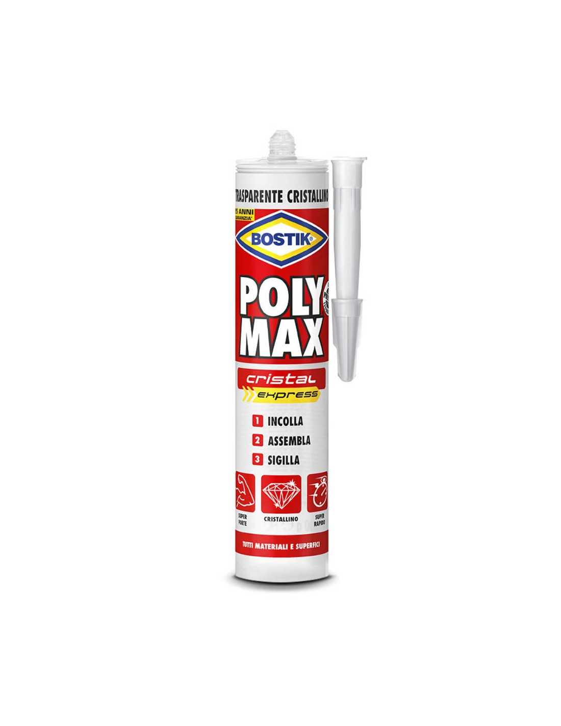 Bostik Poly Max D6114 Cristal Express è un adesivo cristallino di ultima tecnologia ed è estremamente rapido. Aderisce su tutte le superfici, incolla tutti i materiali e ha una resistenza finale di estrema rapidità. é utilizzato in tutti i campi, all'esterno come all'interno, sigilla ed incolla anche in immersione e non teme muffe o presenza di umidità. Resiste da -40°C a +100°C.