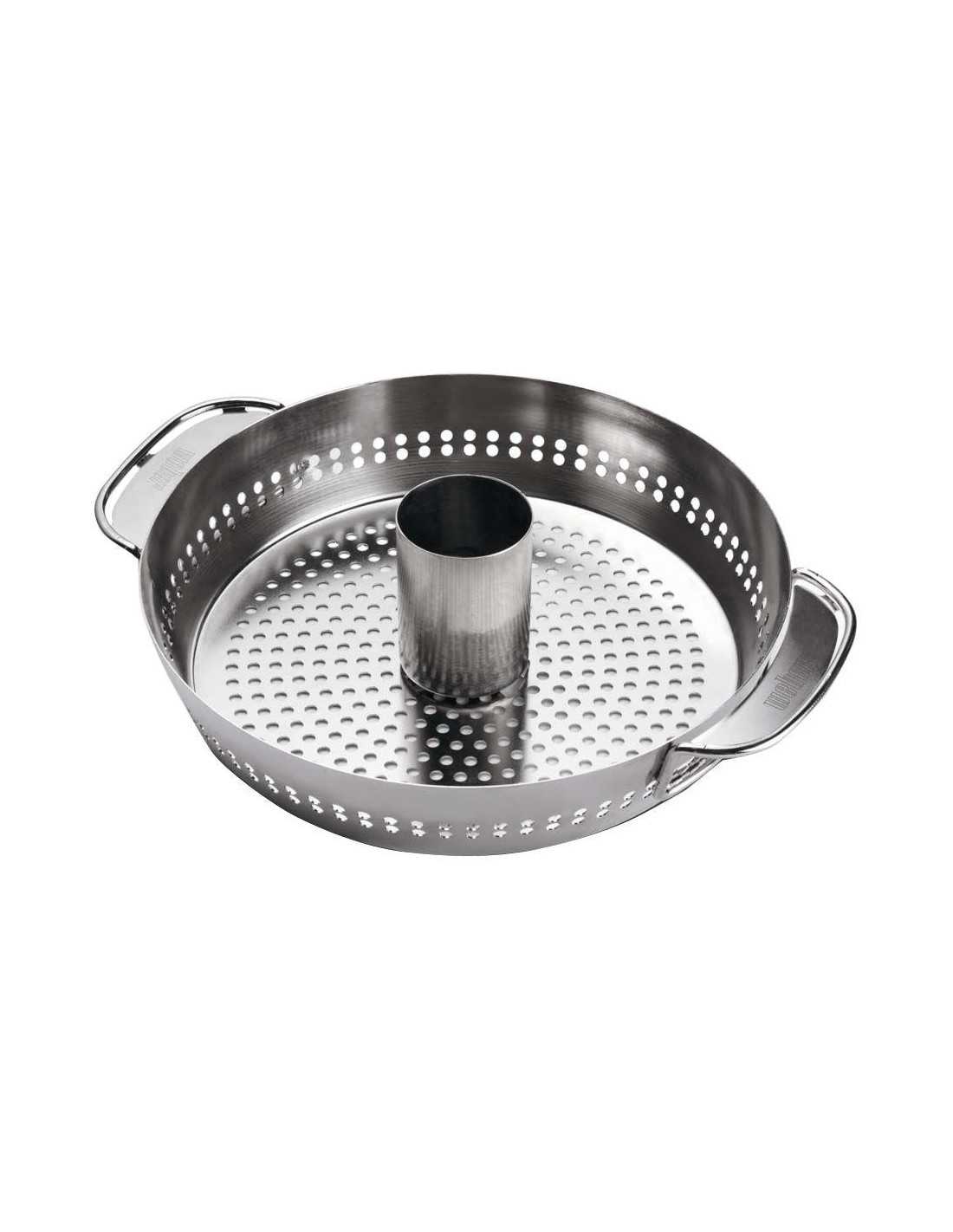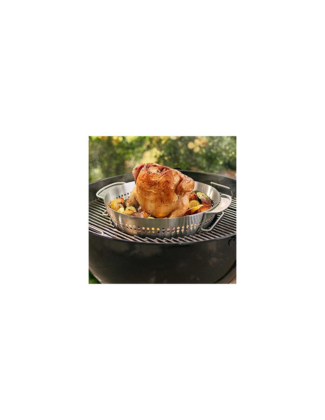 Il Supporto di cottura per pollo Deluxe Weber consiste di un largo cestello forato dalle dimensioni compatibili con il Gourmet Barbecue System Weber, presente sulla maggior parte dei dispositivi. Al centro del cesto si trova un contenitore cilindrico che può essere riempito con qualsiasi liquido (birra, vino, succo di frutta, ecc) per la realizzazione del famoso Beer Can Chicken, o sia il pollo seduto alla birra.