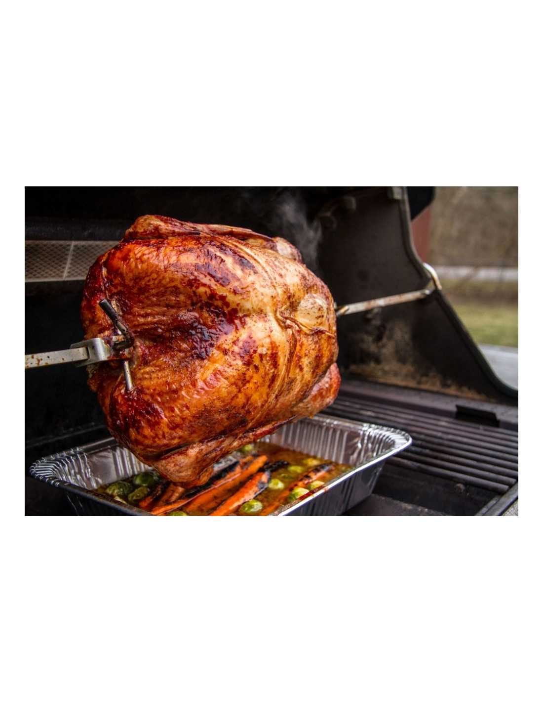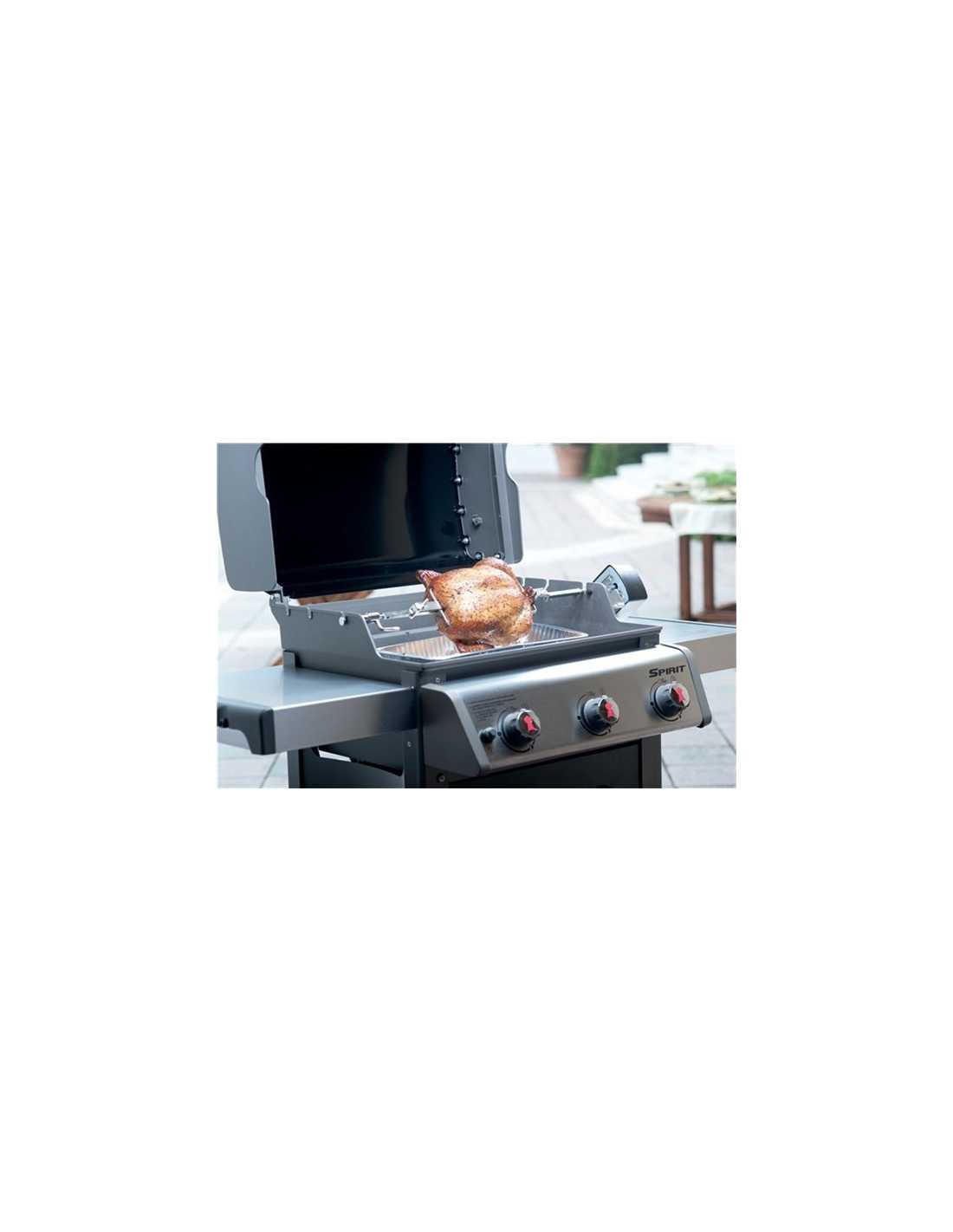 Il Girarrosto per Weber Spirit è composto da una robusta asta di acciaio per sostenere polli, arrosti e porchette, da un paio di forchettoni che fermano le preparazioni per impedire che ruotino intorno all'asta, e da un motore che è collocato all'esterno del grill ad'una delle estremità dell'asta e conferisce una rotazione costante per una rosolatura uniforme.
