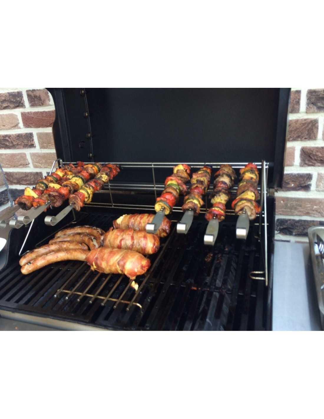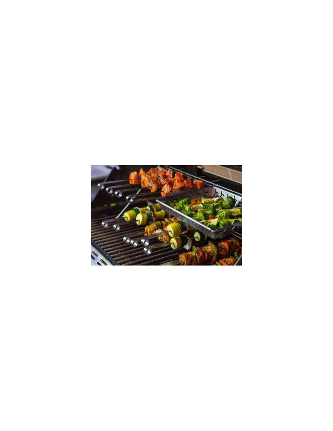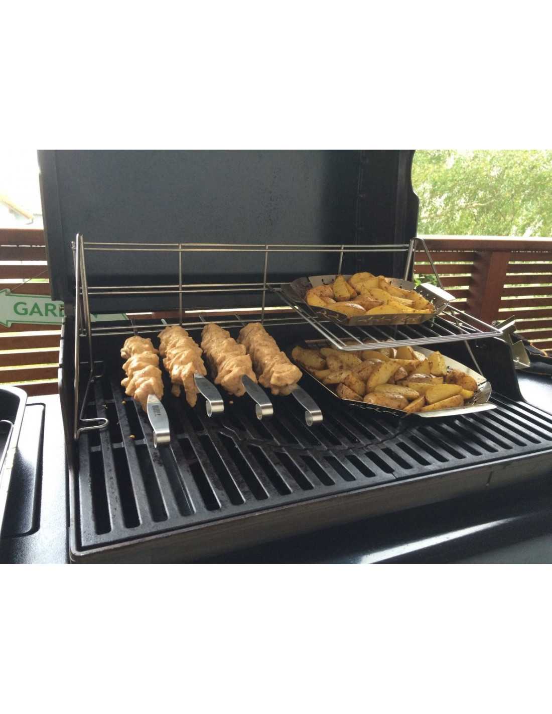 Non solo posso cucinare su più livelli con spiedini, vassoio per verdure sopraelevato, e supporto per cosce di pollo, ma allo stesso tempo in questo modo guadagnate spazio sulla griglia, visto che state lavorando in sospensione.