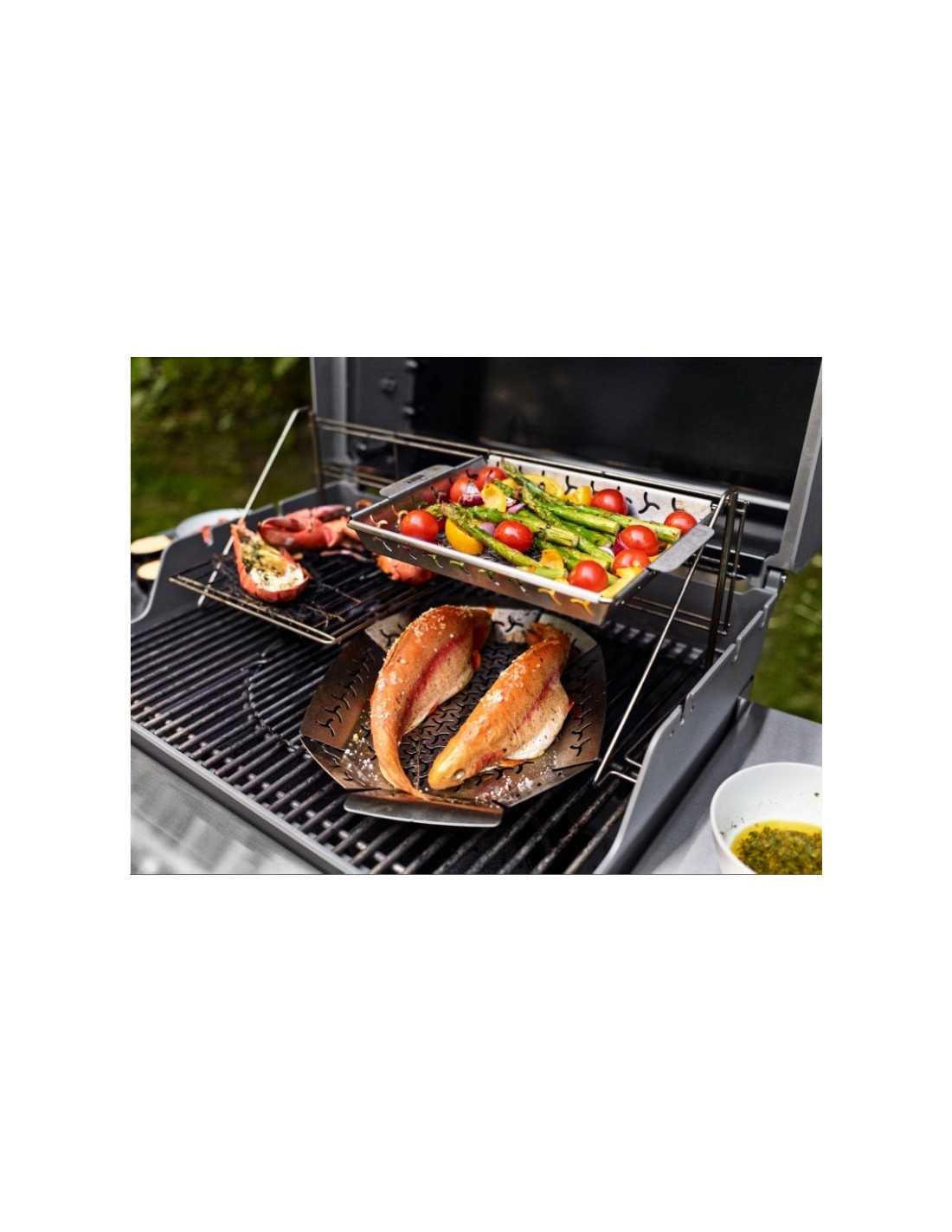 Il Supporto Weber per cosce di pollo è una griglia in acciaio da utilizzare sul supporto ECTS per la cottura multilivello ; è realizzato in acciaio e consiste in una griglia a tondini paralleli che ti consente di inserirvi numerose cosce di pollo. La cottura sarà quindi perfettamente omogenea poiché il pollo non toccherà la griglia.